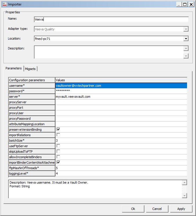 | client\_id\_prefix        | <p>This is the prefix of the Client ID that is passed to every Vault API call.  The Client ID is always logged in the report log. </p><p>For a better identification of the requests (if necessary) the default value should be changed to include the name of the company as described here: <a href="https://developer.veevavault.com/docs/#client-id"><https://developer.veevavault.com/docs/#client-id></a></p><p><strong>Default value =</strong> fme-vault-client-migrationcenter</p> |