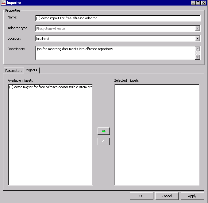 On the | Migsets | tab, the user can select the migration sets to be imported with this importer. Depending on the chosen Adapter Type only the migration sets compatible with this type of importer will be displayed and can be selected for import. Also, only migration sets containing at least one object in a validated state will be displayed (since objects which haven’t been validated cannot be imported).