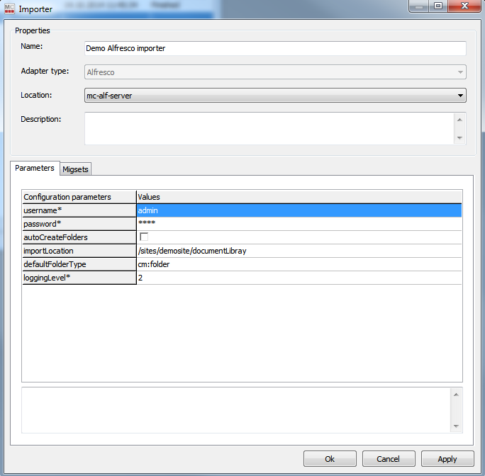 Importer: When configuring the importer on the |Parameters| tab, the “importObjects” and “autoCreateFolders” options are not used for the folder-only migration. Note that these parameters will still be in effect if other migration set(s) containing <SourceType>ToAlfresco(document) objects will be imported together with the folder migration set.