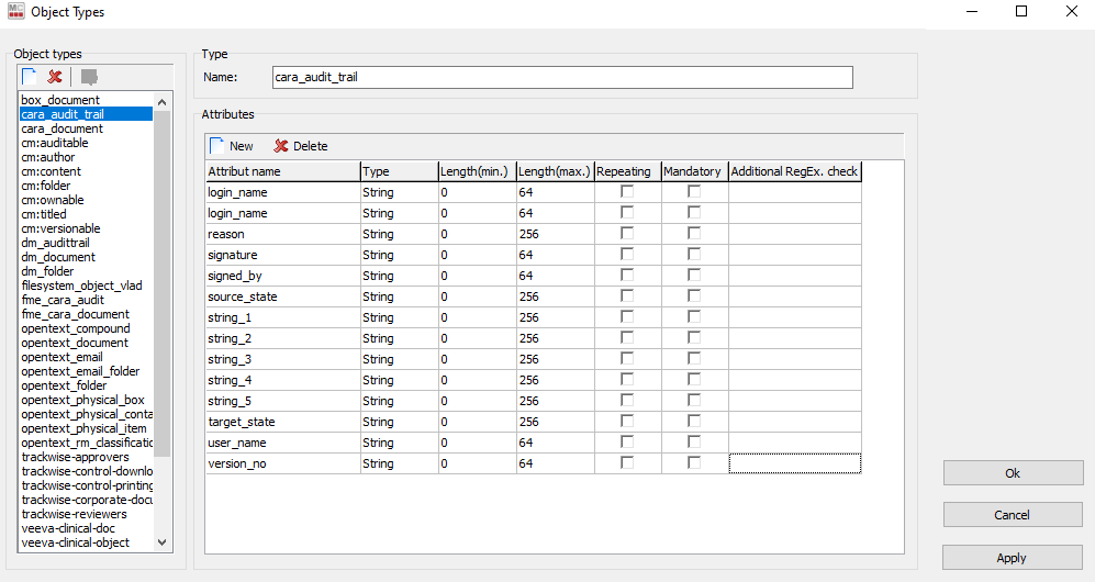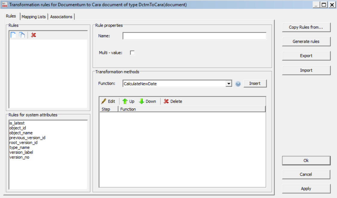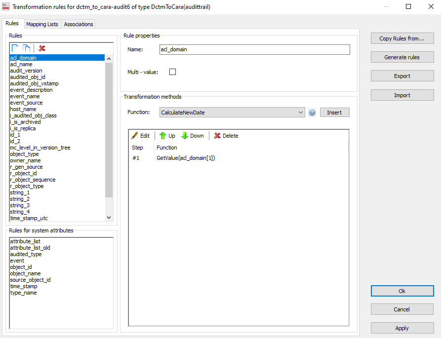 Cara importer allows importing audit trails from Documentum source system to any supported Cara platform. For that, a migset of type DctmtoCara(audittrail) must be created. After you created the desired migration set and you have selected the objects to import from the scan runs, you need to configure the migration set's transformation rules.