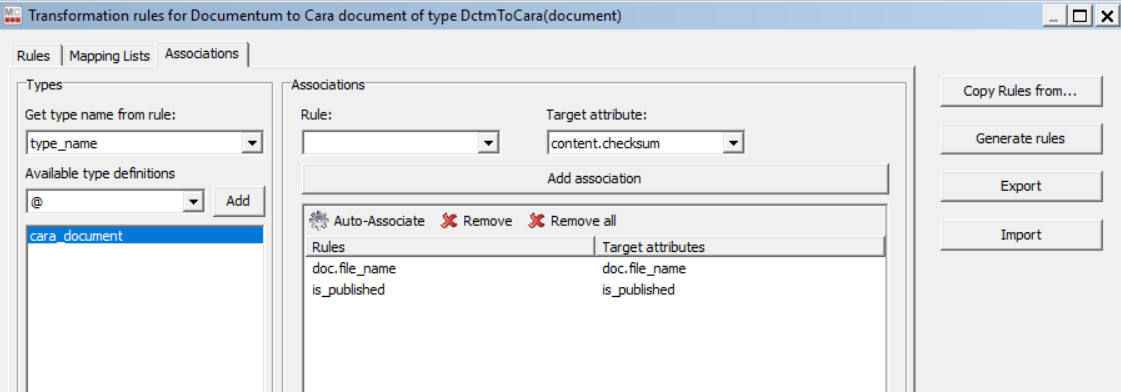 The Cara Importer can also set additional standard or custom attributes on the documents by defining the attributes in a target object type first and associating transformation rules to them. For example the predefined type cara_document can be used to add one standard attribute and one custom attribute.