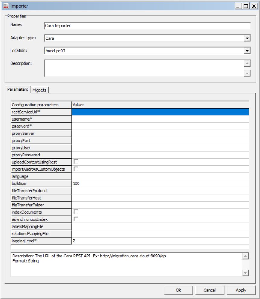 To create a new Cara Importer job click on the New Importer button and select "Cara" from the adapter type dropdown list. Once the adapter type has been selected, the parameters list will be populated with the Cara parameters.