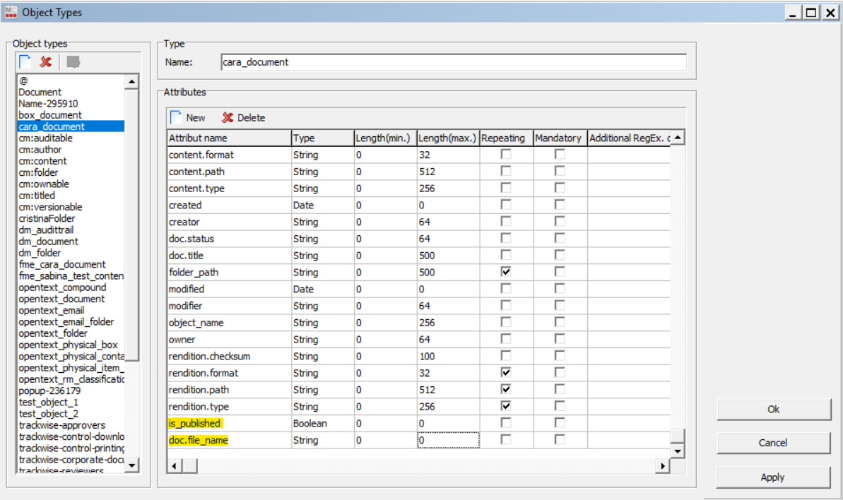 A new standard attribute is_published was added to the cara_document object type and a custom one doc.file_name. The custom attribute name in Cara is file_name, but in migration-center the custom attributes are prefixed with "doc.".