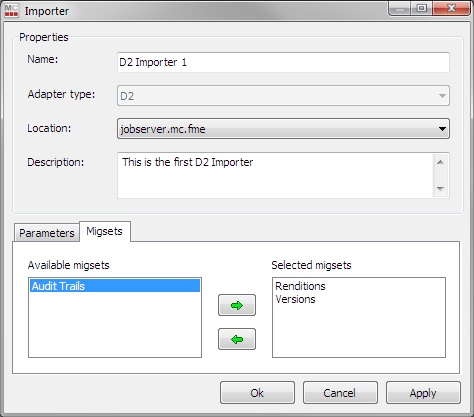 On the | Migsets | tab, the user can select the migration sets to be imported with this importer. Depending on the chosen Adapter Type only the migration sets compatible with this type of importer will be displayed and can be selected for import. Also, only migration sets containing at least one object in a validated state will be displayed (since objects which haven’t been validated cannot be imported).