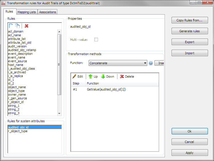 Renditions are supported by the D2 Importer. Rendition information is typically generated during scan, be it by the Documentum Scanner or other scanners supporting systems where rendition information or other similar features can be extracted. Should rendition information not be obtainable using a particular scanner, or if the respective source system doesn’t have renditions at all, it is still possible to add files as renditions to objects during the transformation process. The renditions of an object can be controlled through the migration-center system attribute called dctm_obj_rendition. The dctm_obj_rendition attribute appears in the “System attributes” area of the Transformation Rules window. If the object contains at least one rendition in addition to the main content, the source attribute dctm_obj_rendition will be available for use in transformation rules. To keep the renditions for an object and migrate them as they are, the system attribute dctm_obj_rendition must be set to contain one single transformation function: GetValue(dctm_obj_rendition[all]). This will reference the path of the files where the corresponding renditions have been exported to; the Importer will pick up the content from this location and add them as renditions to the respective documents.