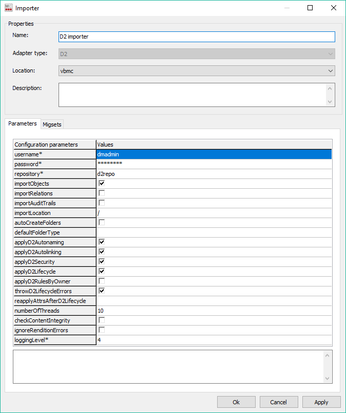 To create a new D2 Importer job specify the respective adapter type in the New Importer Properties window – from the list of available connectors “D2” must be selected. Once the adapter type has been selected, the Parameters list will be populated with the parameters specific to the selected adapter type, in this case the D2 connector’s parameters.