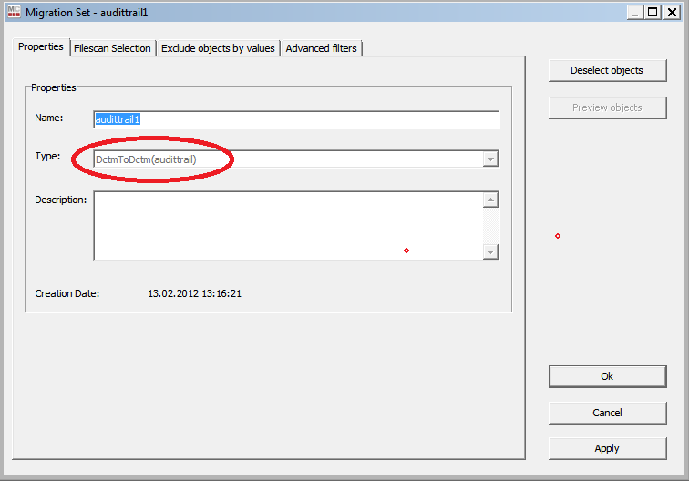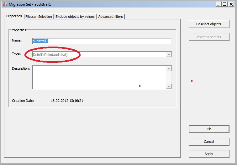 In order to prepare audit trail for import, first create a migset containing audit trail objects (more than one migset containing audit trails can be created, just like for documents or folders). For a migset to work with audit trails, the type of object must be set “DctmToDctm(audittrail)” accordingly. After setting the migset type to “DctmToDctm(audittrail)” the | Filescan | tab will display only scans which contain Documentum audit trail objects. Any of these can be added/removed to/from the migration set as usual.