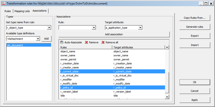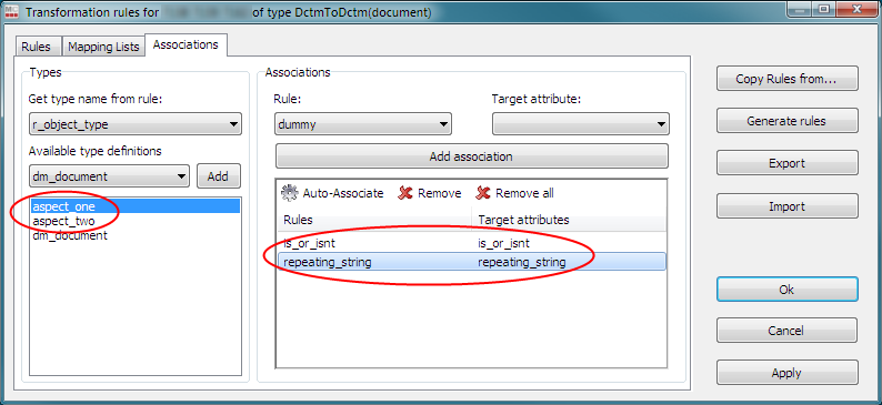 As with an actual object type, transformation rules used to generate values for attributes defined through aspects will need to be associated with the respective aspect types and attributes – again, just use aspects as if they were actual object types while on the Associations page of the Transformation Rules window.