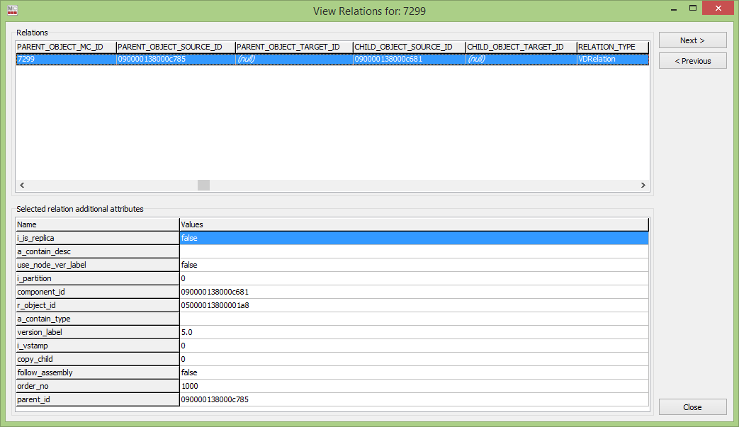 Relations cannot be altered using transformation rules; migration-center will manage them automatically if the appropriate options in the scanner and importer have been selected. A connection between the parent object and its relations must always exist and can be viewed in migration-center by right-clicking on the object in any view of a migration set and selecting <View Relations> from the context menu. A grid with all the relations of the selected object will be displayed together with their associated metadata, such as relation name, child object, etc.