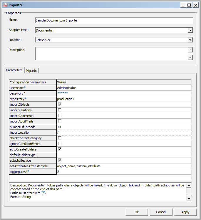The Documentum Importer takes the objects processed in migration-center and imports them into a Documentum repository. As a change in migration-center 3.2, the Documentum scanner and importer are no longer tied to one another – any other importer can now import data scanned with the Documentum Scanner and the Documentum Importer can import data scanned by any other scanner. Starting from version 3.2.9, it supports objects derived from dm_sysobjects.