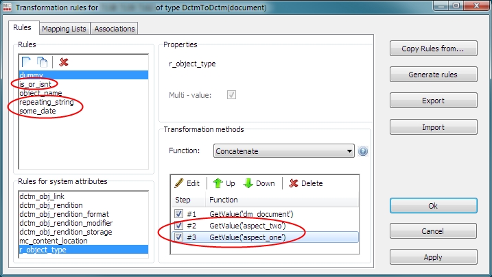 During transformation, aspects are assigned just like actual object types to Documentum objects using the r_object_type system rule; the r_object_type system rule has been modified to accept multiple values for Documentum documents and folders, thus allowing multiple aspects to be specified