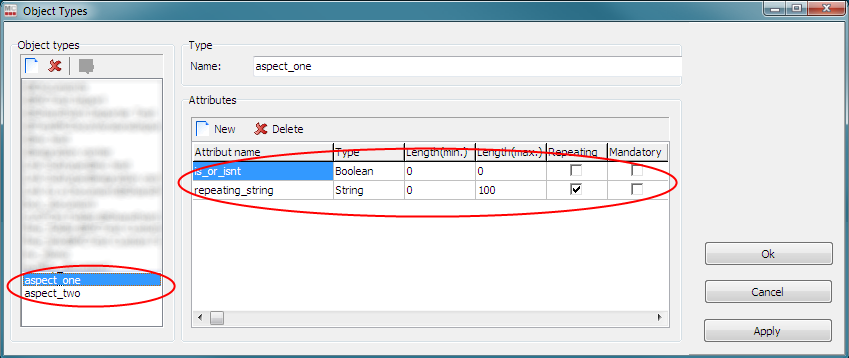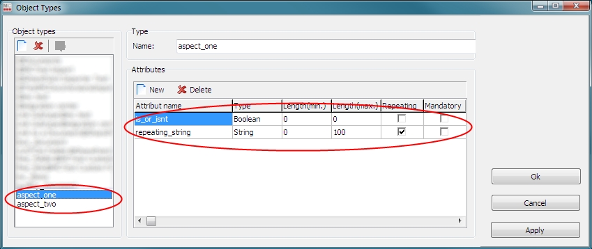 As with actual object types, all references to aspects will need to be valid in order for the object to be imported successfully. Trying to set invalid aspects or aspect attributes will cause the object to fail on import.