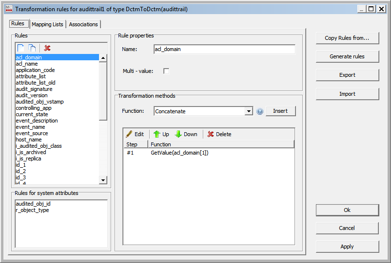 Transformation rules allow setting values for the attributes audit trail entries on import to the target system. Values can be simply carried over unchanged from the source attributes, or they can be transformed using the available transformation functions. All attributes that can be set and associated are defined in the target type “dm_audittrail”.