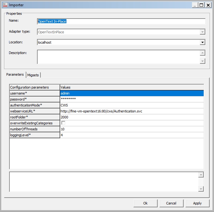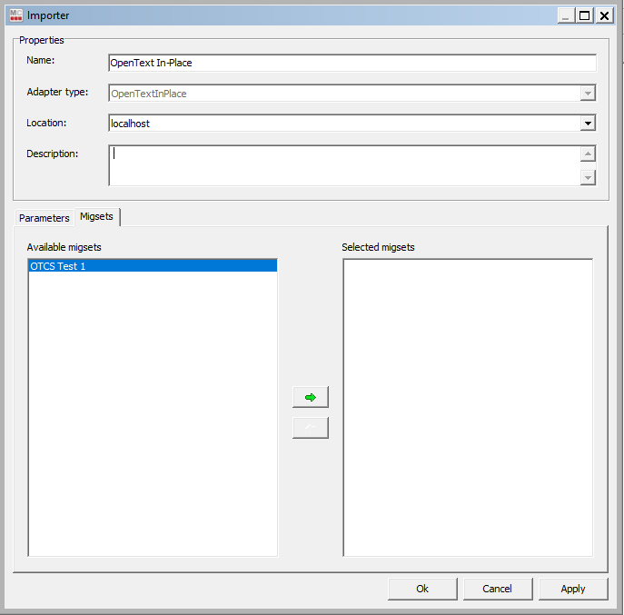To create a new OpenText InPlace Importer job specify the respective adapter type in the importer’s Properties window – from the list of available connectors, “OpenText InPlace” must be selected. Once the adapter type has been selected, the Parameters list will be populated with the parameters specific to the selected adapter type, in this case, OpenText InPlace.