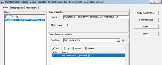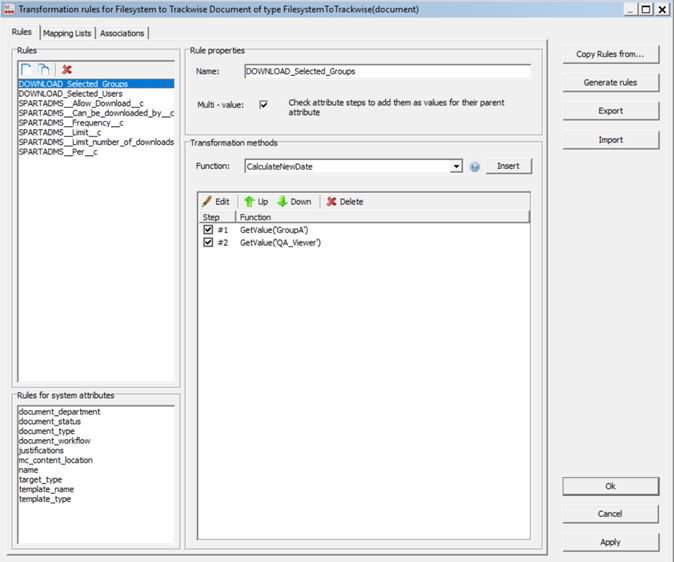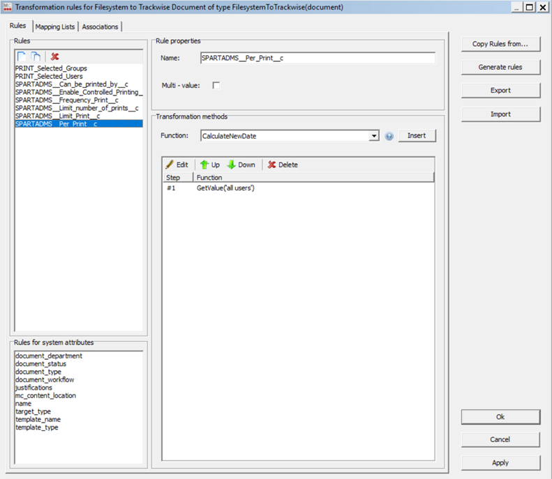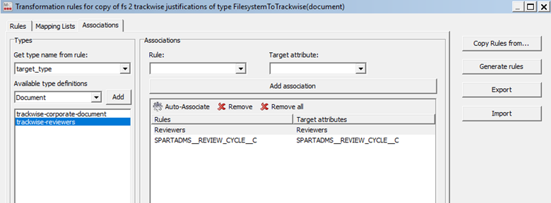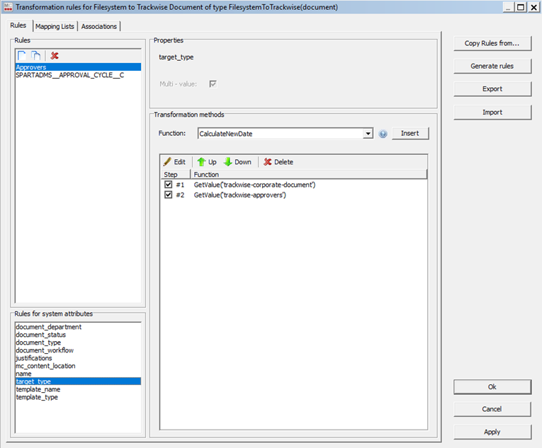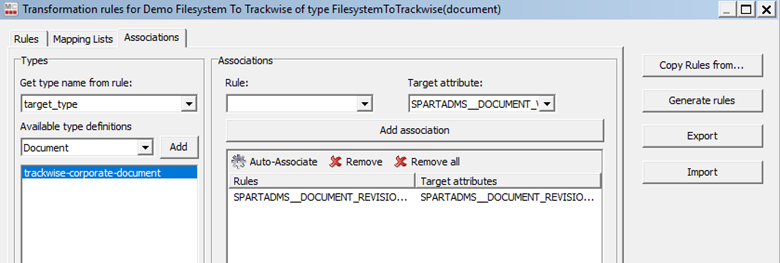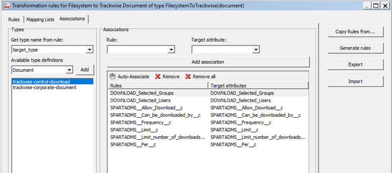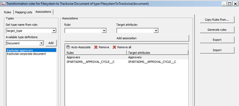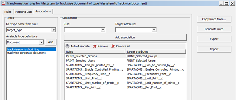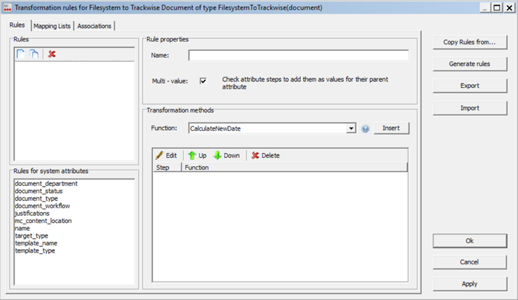 After you have selected the objects to import from the file scans, you need to configure the migration set’s transformation rules. A migration set with a target type of “Trackwise(document)” has the following system attributes.