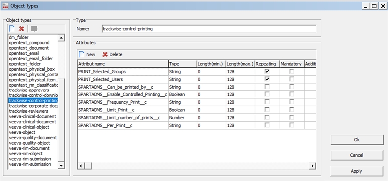 To set those attributes you need to use the “trackwise-control-printing” object type which can be found if you access the Manage ->Object Types option.