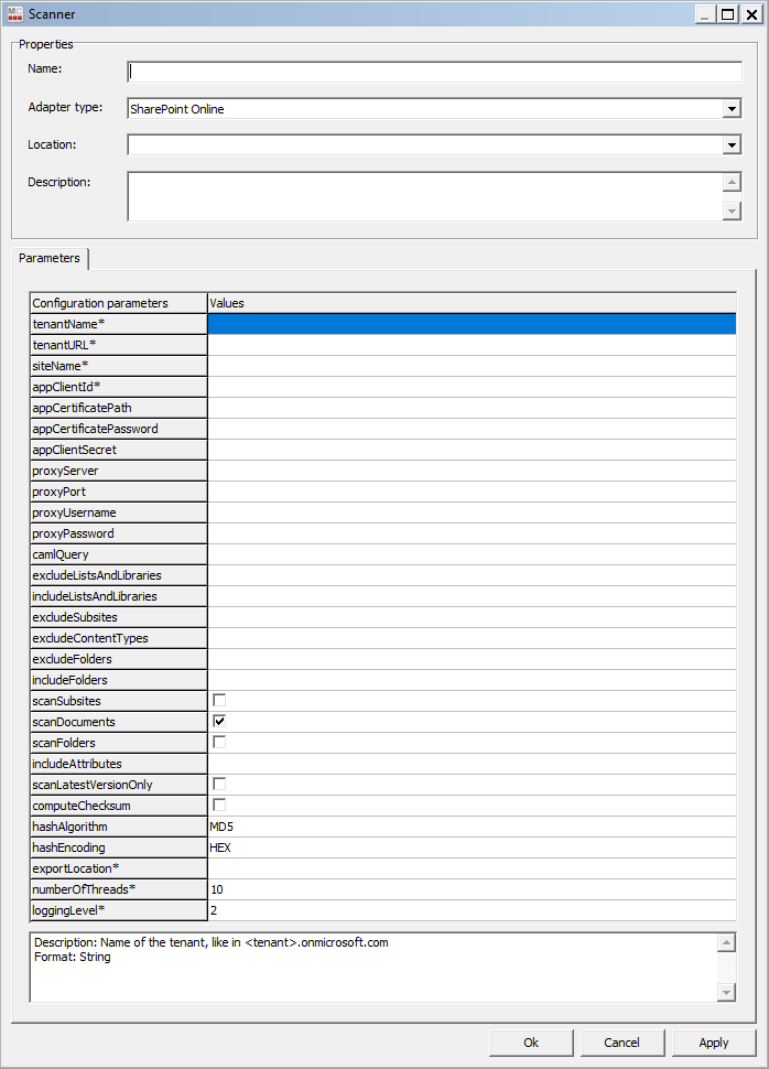 In order to use Azure AD app-only principal authentication with the SharePoint Online scanner you need to fill in the following scanner parameters with the information you gathered in the steps above: