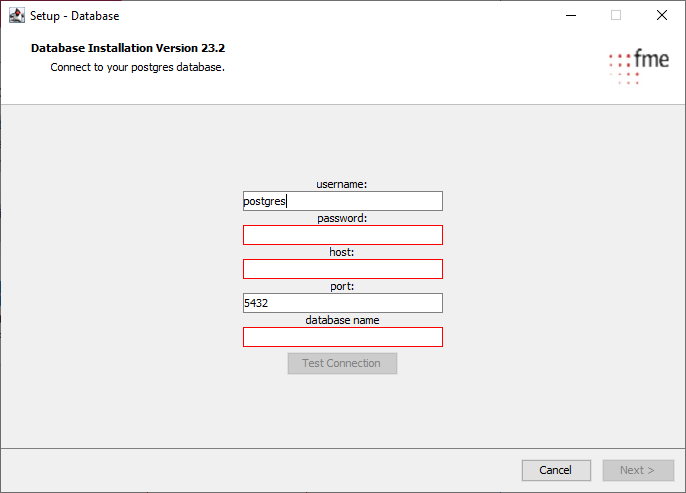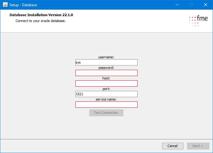 Insert the details for connecting to the database instance where you want to install the migration-center FMEMC schema. Set username, password. The user must be the predefined SYS user or an Oracle administrative user with enough privileges. Then set the database details host, port and service name.