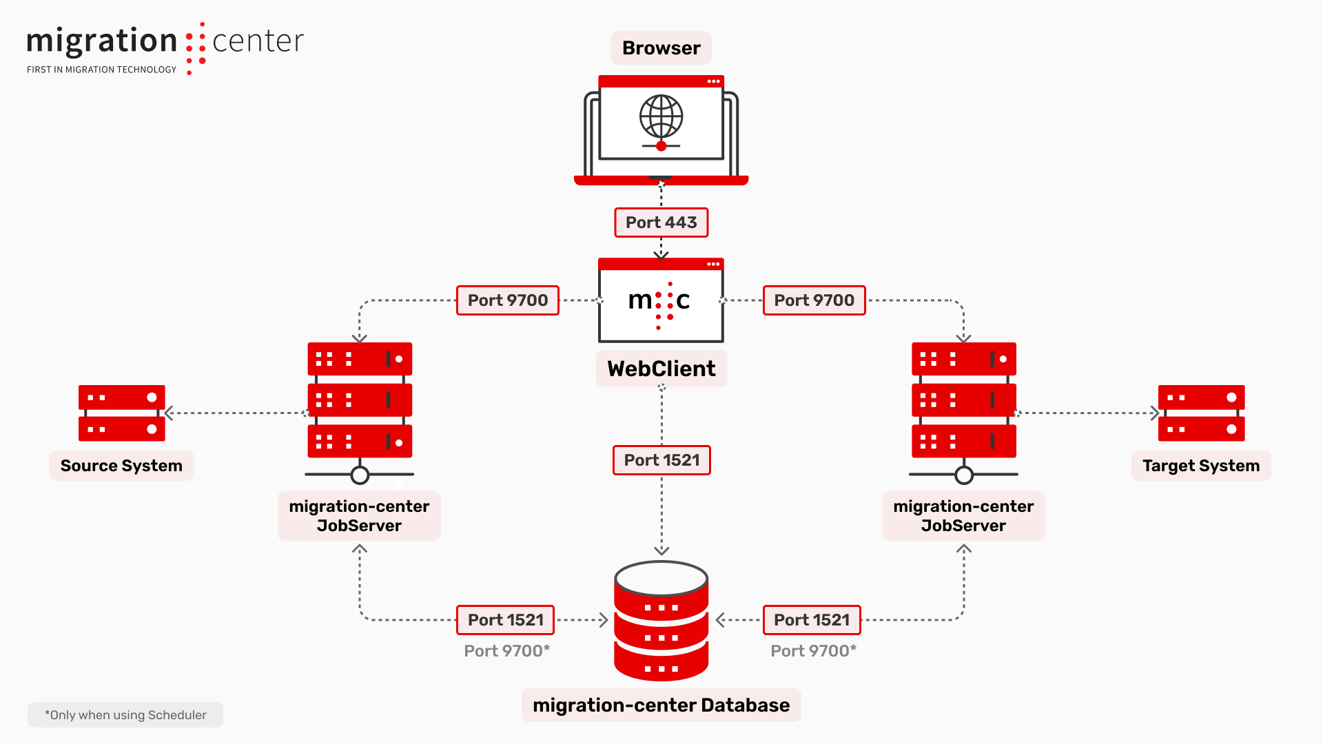 Migration-center has 3 main components: Database component, WebClient and Jobserver component.
