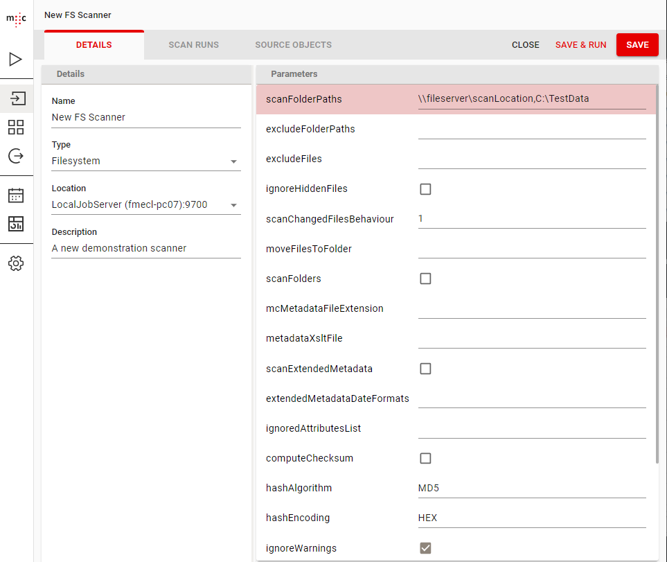 After you have filled at least the mandatory parameters of the scanner configuration you can save it by clicking on Save.