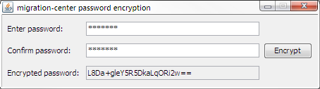 Passwords must be encrypted when saved to the configuration file. Encryption is performed using the supplied password encryption tool. The password encryption tool is located in the <migration-center Server Components installation folder>/lib/mc-dctm-adaptor/security-config folder and can be executed using encrypt-tool.