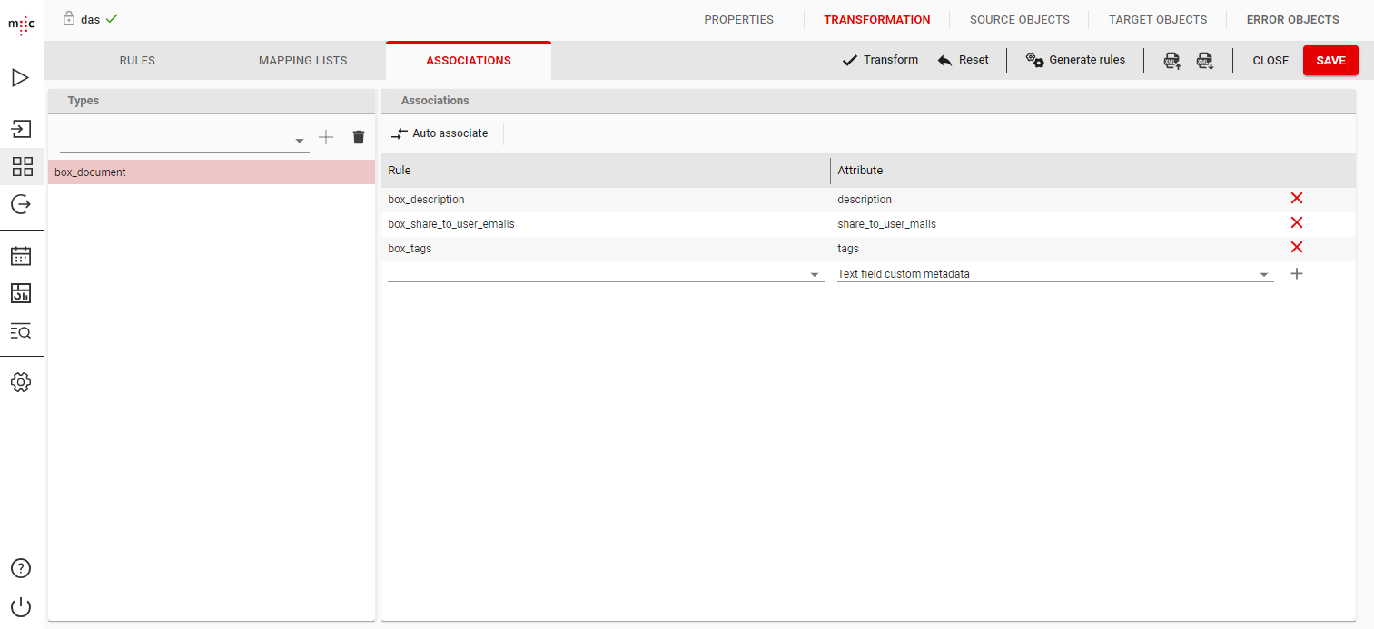 If rules for specific attributes are defined, the values need to be associated with the target attributes of a box_document. This is done on the Associations tab of the –Transformation Rules- window by selecting the box_document object type and pointing the target_type rule at it. In this case the value output by the target type rule should be “box_document”, as it must match the object type selected below.