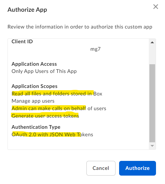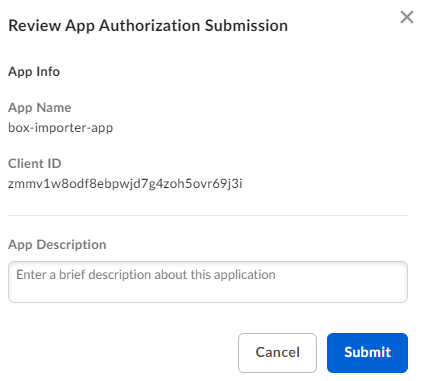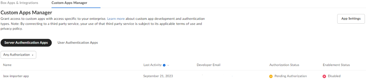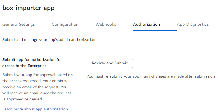 Before the application can be used, a Box Admin needs to authorize the application within the Box Admin Console.
