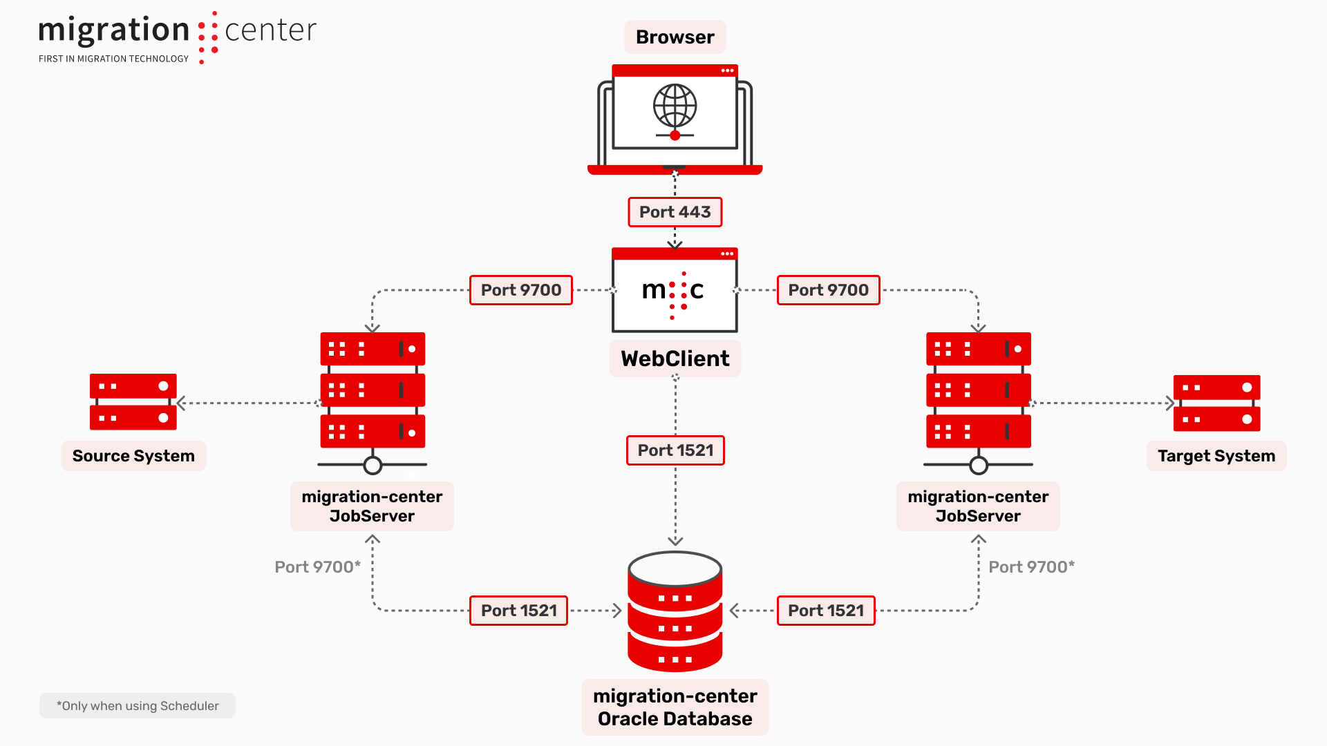 - to the Browser via port 443 - to the Database using connection via information provided by the user (default: 1521 for Oracle, 5432 for Postgres) - to the Jobserver via port 9700 by default