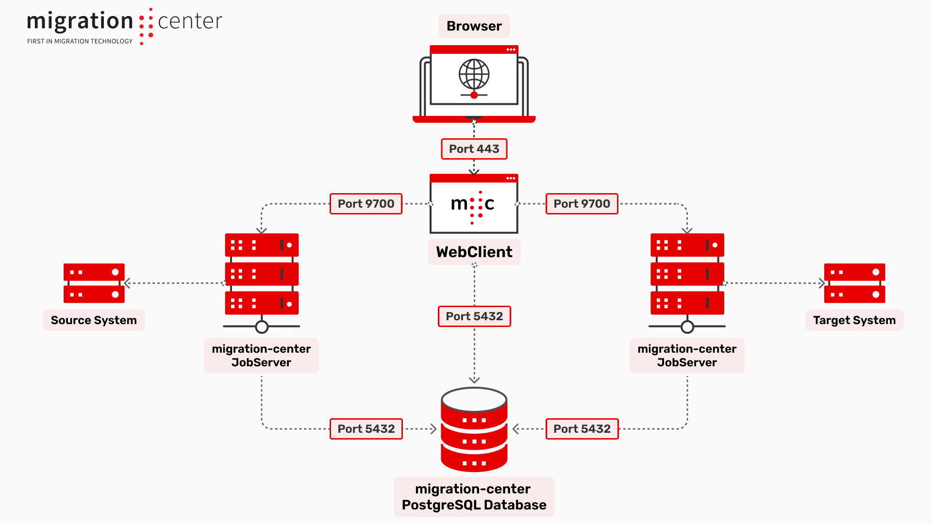 Migration-center has 3 main components: Database component, WebClient and Jobserver component.