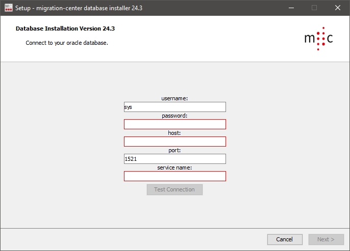 Insert the details for connecting to the database instance where you want to install the migration-center FMEMC schema. Set username, password. The user must be the predefined SYS user or an Oracle administrative user with enough privileges. Then set the database details host, port and service name.