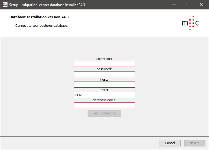 Insert the details for connecting to the database instance where you want to install the migration-center FMEMC schema. Set username, password. The user must be the predefined postgres user or a PostgreSQL administrative user with enough privileges. Then set the database details host, port and database name.