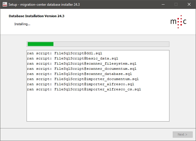 The installer prepares the database for use with migration-center by creating a user, tables, installing the packages containing migration-center functionality and setting default configuration options. All of these objects will be created in a schema called FMEMC. Currently it is not possible to change the schema’s name or install multiple schemas on the same database instance.