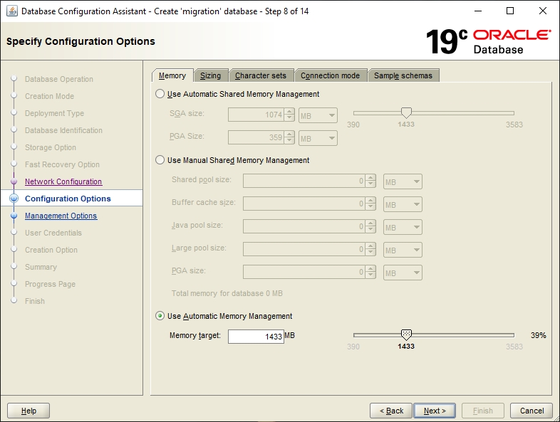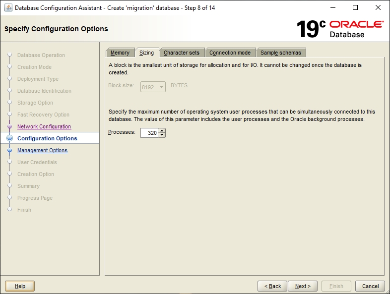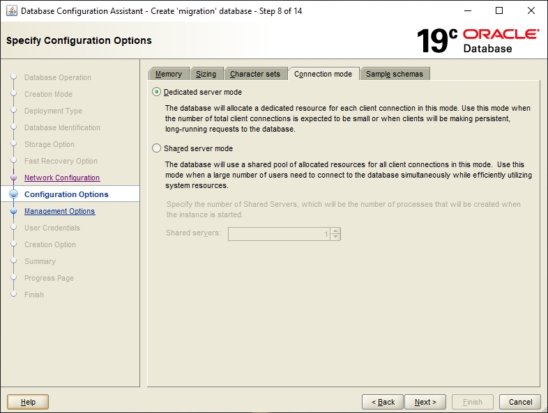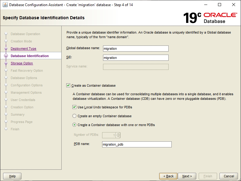Define the database name here. The name must be unique, meaning that there should not be another database with this name on the network. The SID is the name of a database instance and can differ – if desired - from the global database name. In order to make an easy identification of the database possible, a descriptive name should be selected, for instance „migration“.