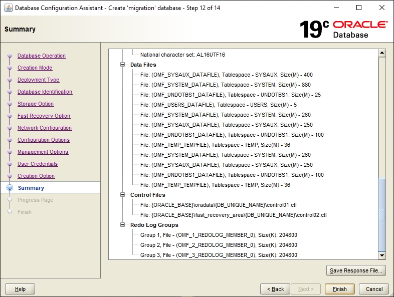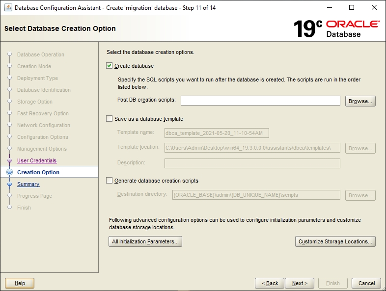 Optionally a script can be generated which contains all the settings for the creation of this database. With this script, the setup can be repeated later if necessary. Moreover this script can be used as documentation for the settings used.