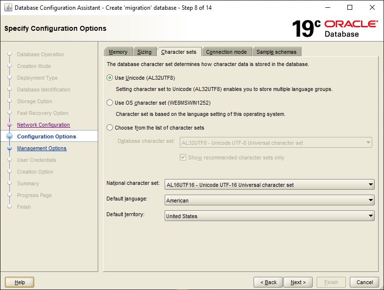 The Unicode character set AL32UTF8 must be selected here. This character set will ensure that all special characters of any language will be correctly saved in the database.