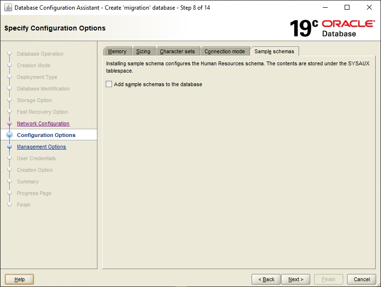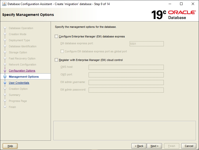 To manage the database, Oracle Enterprise Manager is recommended. In Oracle 19c, databases can be managed centrally using the Grid Control or locally using the Database Control. Since the choice of database management has no influence on the operability of migration-center, this can be configured according to personal preferences or company policies. For the purposes of this guide the local Database Control will not be selected here. E-mail notification and backup can be configured separately at a later time, if necessary.