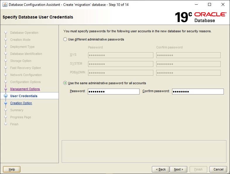 Now the passwords for the Oracle system accounts SYS, SYSTEM and PDBADMIN must be entered and confirmed. These accounts with their passwords are needed for the installation of the migration-center database schema.