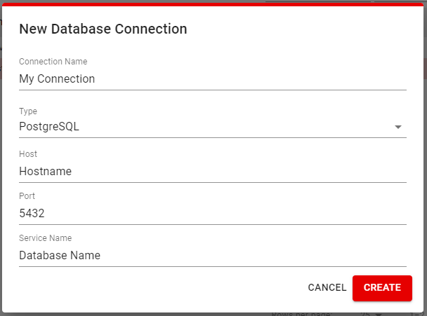 Here you will set a **Connection Name** and the Database **Type**, **Host**, **Port** and **Service Name**(database name) for the database you will be using. Click Create to create the connection and be able to use it when signing in.