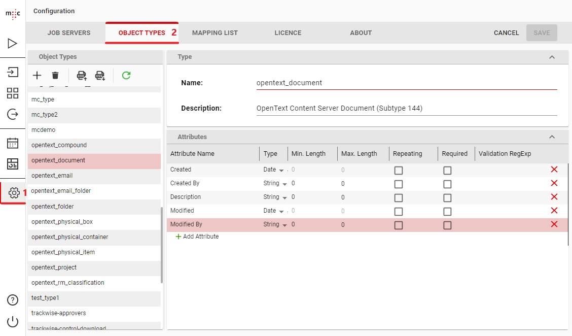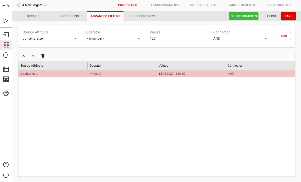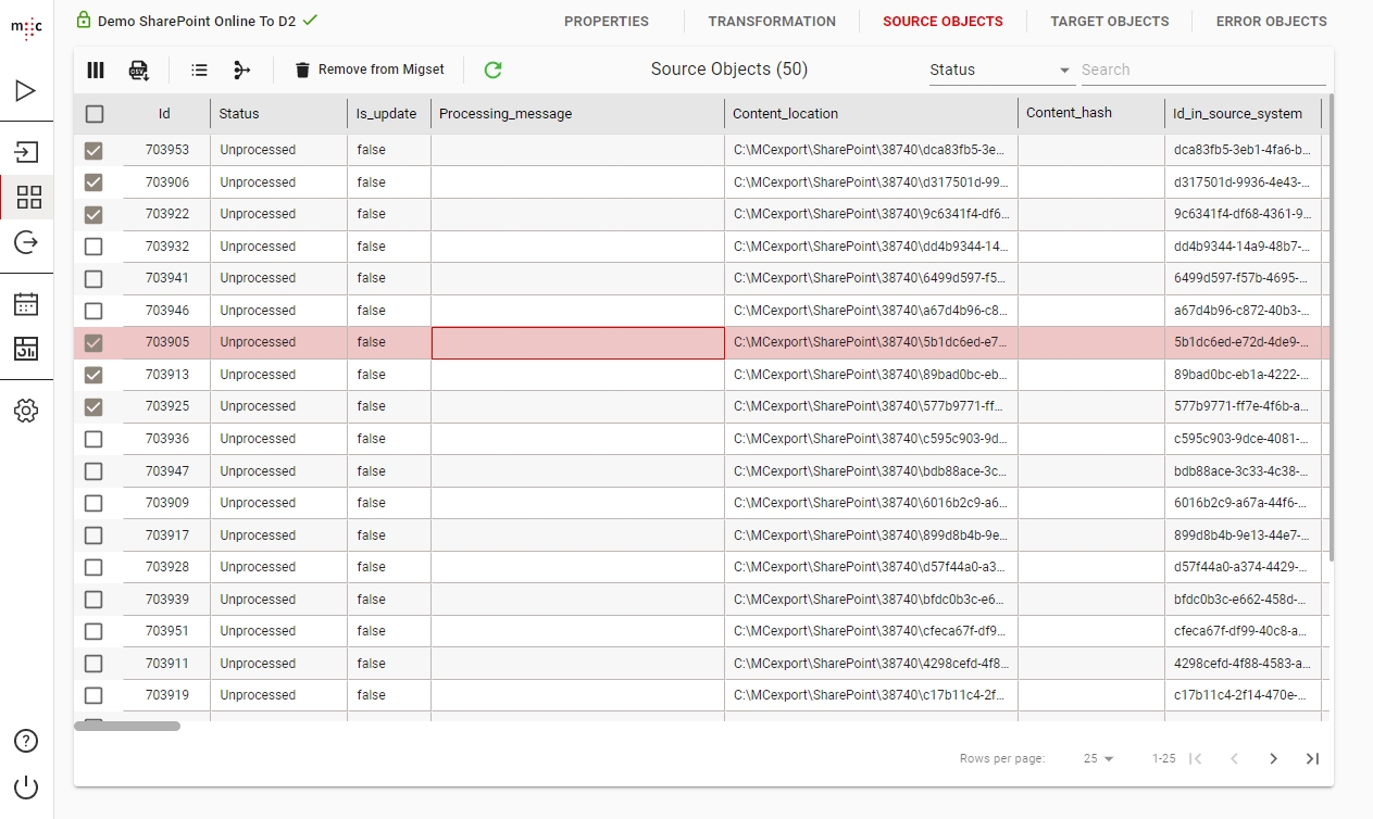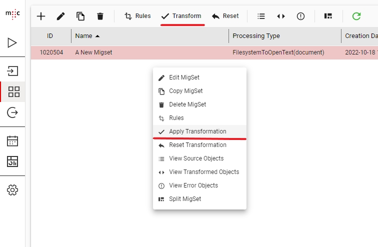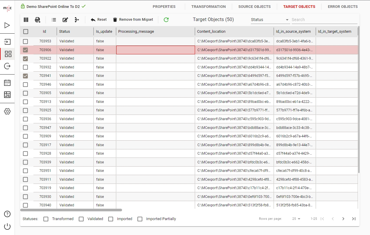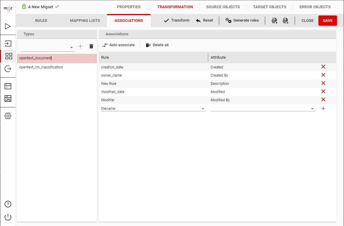 Migration Set A migration set comprises a selection of objects (documents, folders) and set of rules for migrating these objects. A migration set represents the work unit of migration-center. Objects can be added or excluded based on various filtering criteria. Individual transformation rules, mapping lists and associations can be defined for a migration set. Transformation rules generate values for attributes, which are in turn associated by association rules. Objects failing to pass either transformation or association rules will be reported as errors, requiring the user to review and fix these errors before being allowed to import such objects.