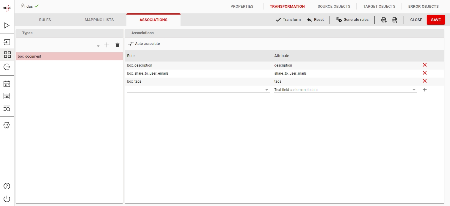 Association Association checks the attribute values resulting from the Transformation step against the definitions of the object types these attributes are associated with. It checks to make sure the values meet basic properties such as data type, length, repeating or mandatory properties of the attributes they are associated with. Only if an object passes association for every one of its attributes will it be allowed for import. Objects which do not pass association are not permitted for import since they would fail anyway.